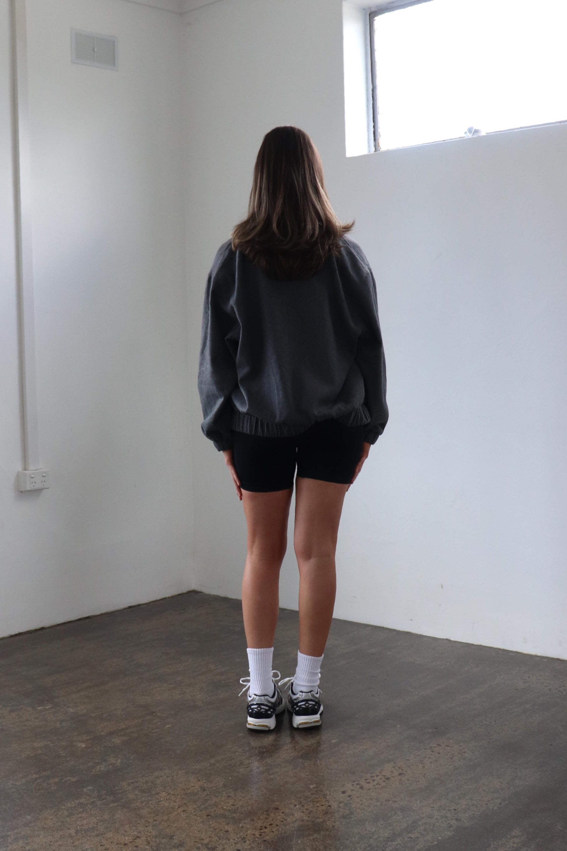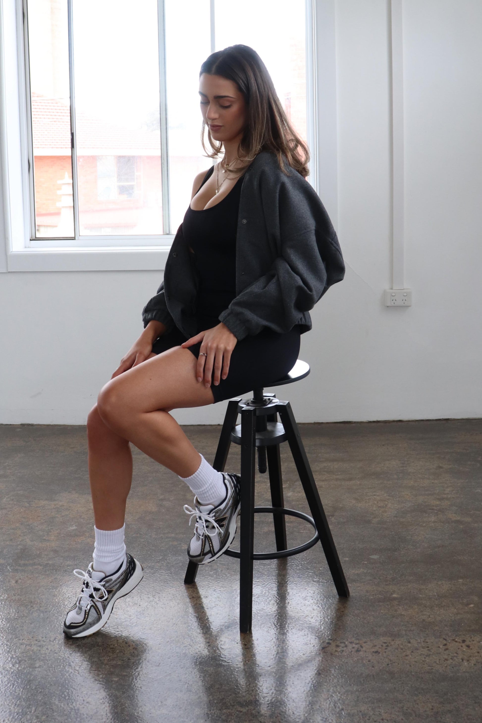 The Charcoal Grey Bomber is a great staple jacket that features a soft textured fabric and creates structure to any outfit. Perfectly paired with our Onyx Playsuit.